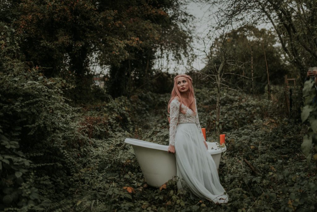 Today’s styled wedding shoot is a first, as it features a bath tub in the middle of a forest! I love the styling here, the autumnal feel but also the magical feel of it ending with a milky bath. It features the dresses designed by Lucy Can’t Dance who we featured earlier this year, and the photography of Megan Elle. Lucy describes the shoot for us: