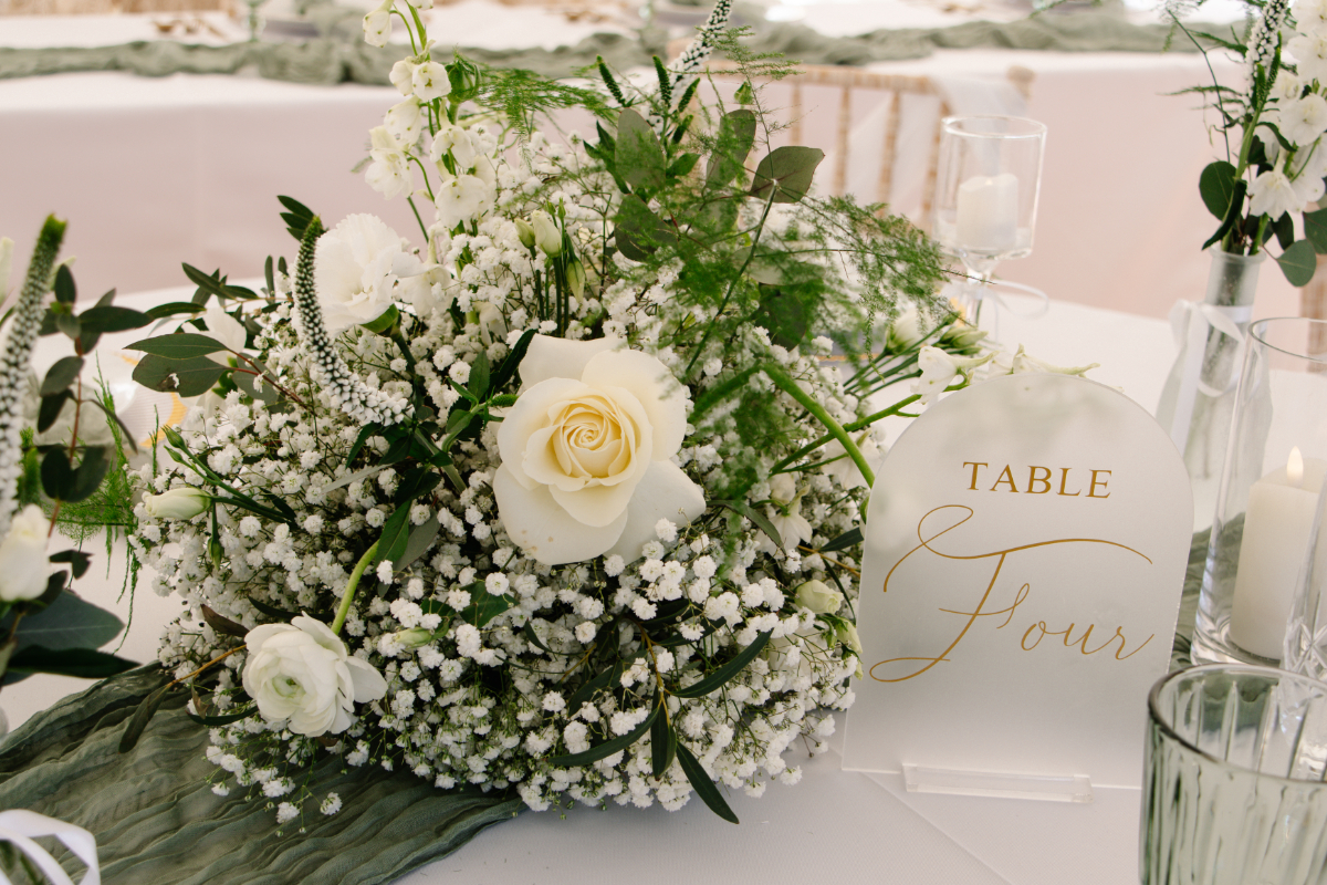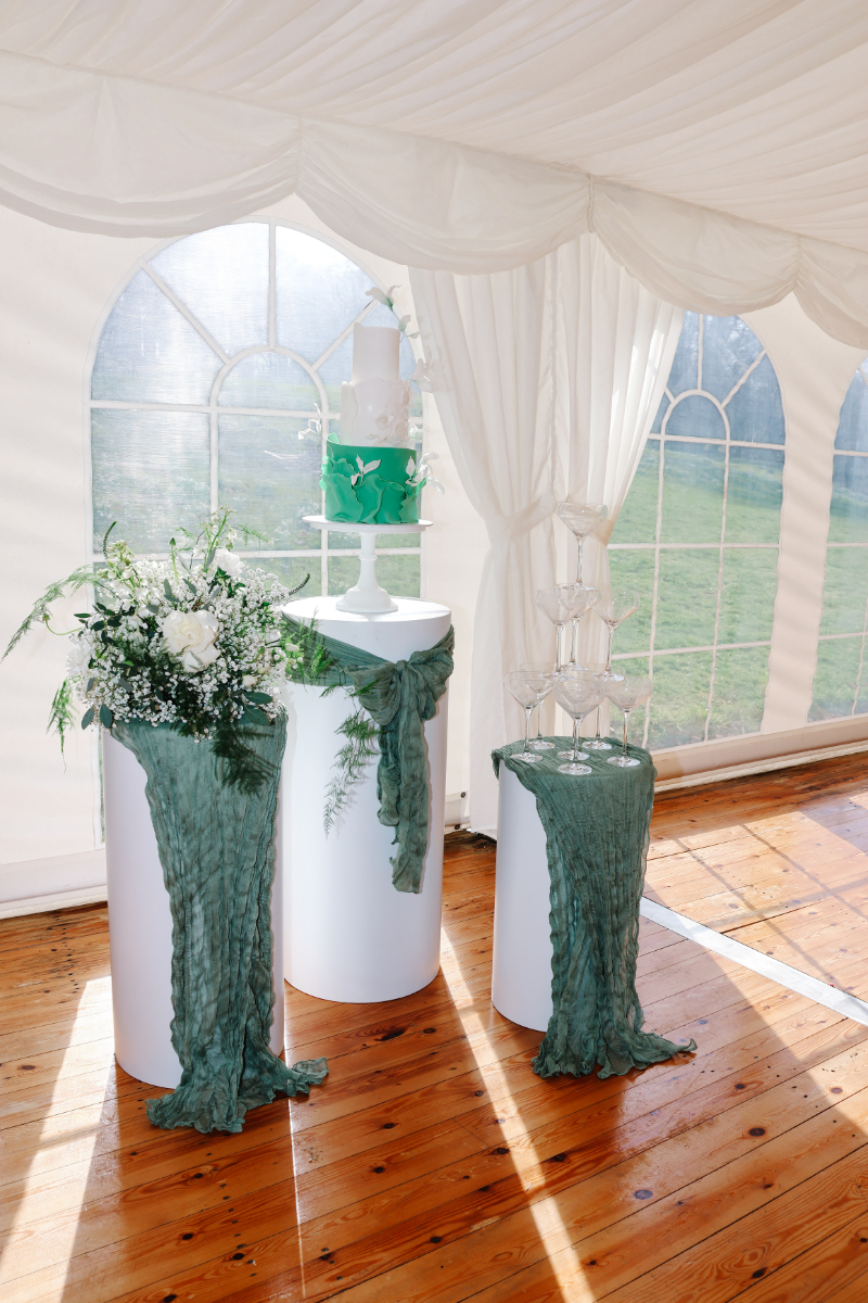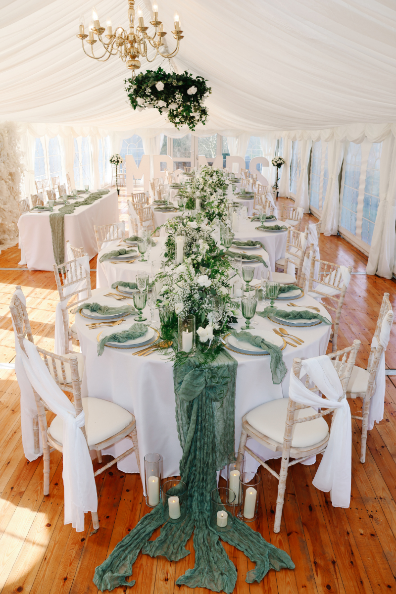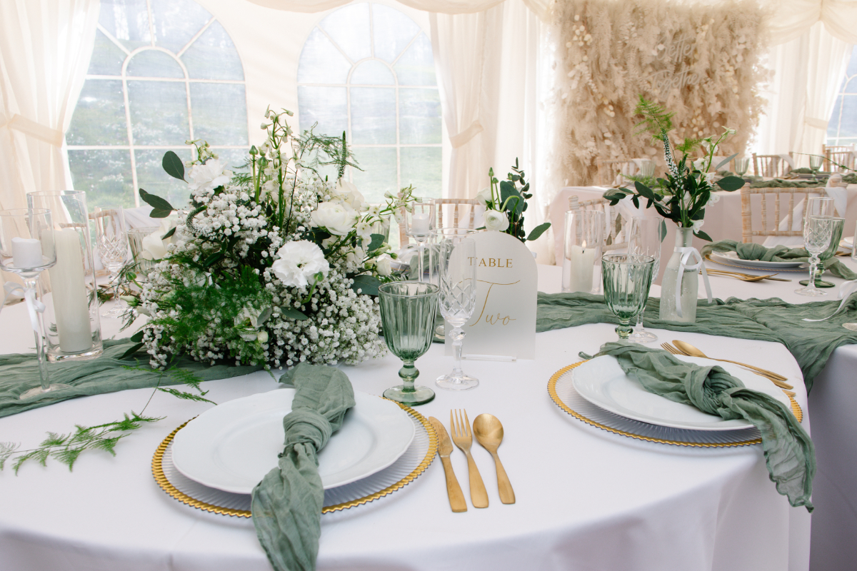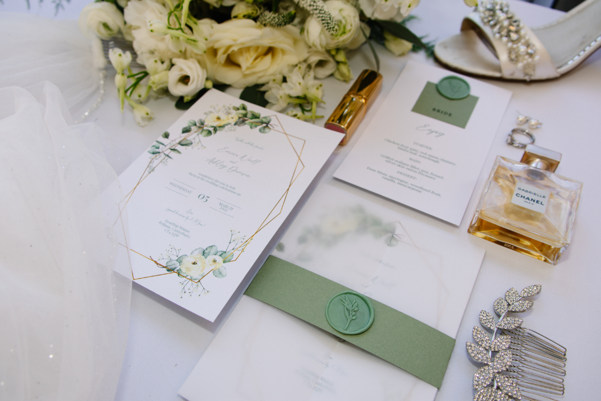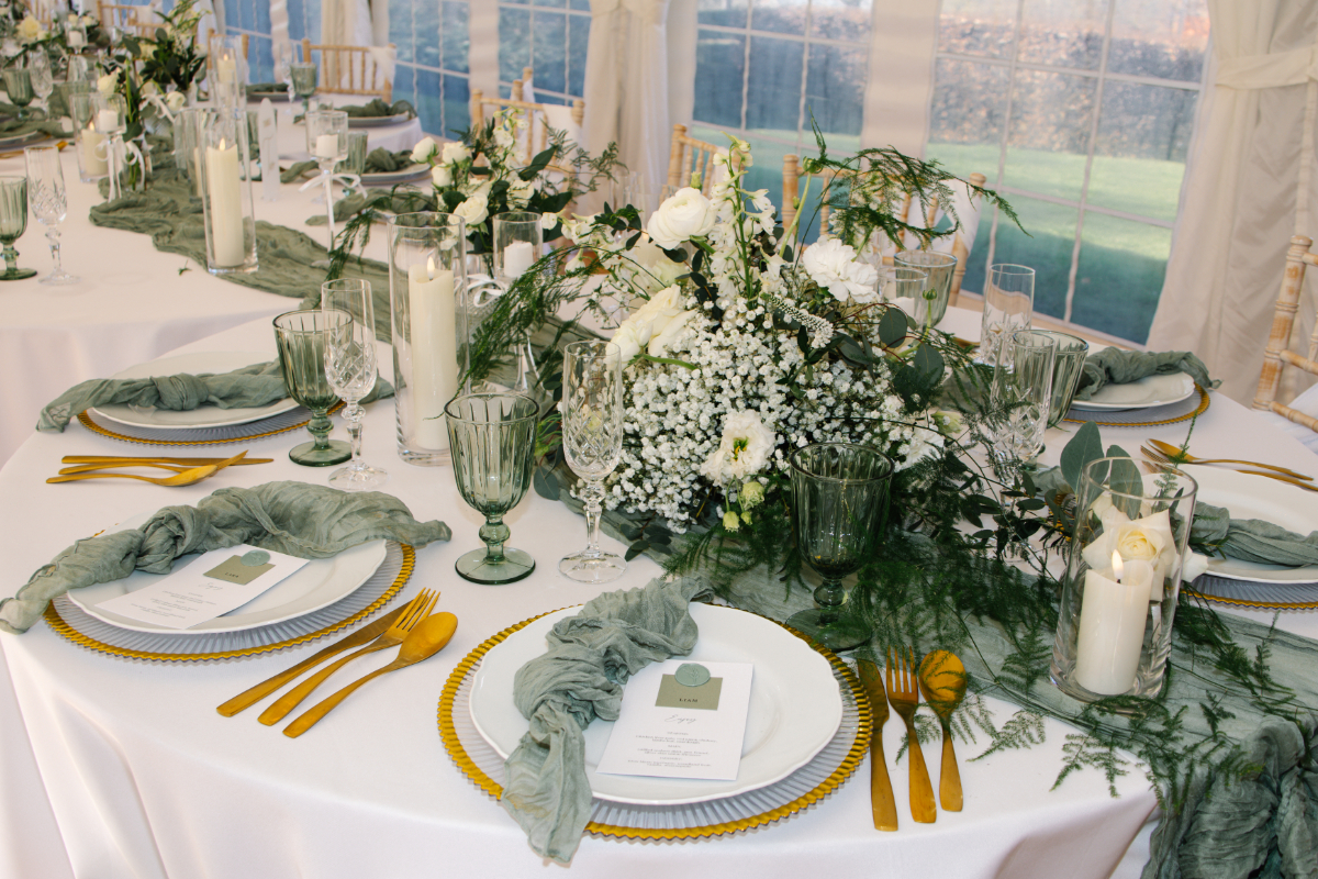 “Swarling Manor is a picturesque wedding venue in Canterbury. With a stunning rural landscape, it’s a beautiful 17th-century Manor House and barn holding indoor and outdoor ceremonies. Greens and whites are classic colours and beautiful if you use them correctly. If you have a vision, go for it. We wanted to capture an intimate wedding with a modern twist for this inspiration. Caterpillar tables seem a new trend, and we wanted to try them ourselves. To create this elegant tablescape, we joined the tables to give a caterpillar effect. We believe this would give a more intimate setting, giving guests a more relaxed experience and the opportunity not just to talk to the guests at the same table. The timeless green pops against the crisp white tablecloth. A crisp, clean look oozes class with glassware and candles, and is finished with crystal champagne flutes and matching wine glasses. Not forgetting the gold trim and cutlery to add glamour. Elegant and timeless, the green, white, and gold wedding stationery suite exudes sophistication and charm. Lush green tones symbolise new beginnings, while crisp white adds a touch of purity and grace. Gold accents hint at luxury, creating a perfect balance of modern elegance and classic romance.”