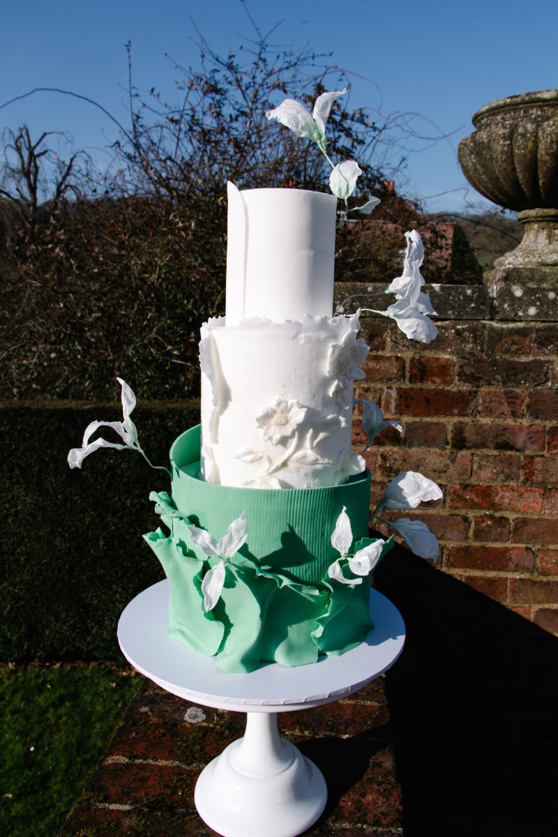 “This elegant sage green and white wedding cake is a timeless masterpiece, perfect for a romantic celebration. Delicately crafted, it features smooth, fondant-covered tiers in a soft sage green hue, beautifully complemented by crisp white accents. Handmade wafer paper flowers, intricately designed with lifelike details, cascade gracefully down the cake, adding a touch of natural beauty and sophistication” Kokoro Bakes