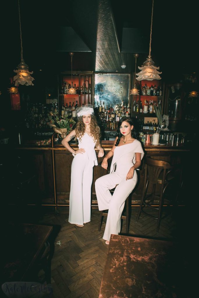 I wanted to create something edgy with a modern twist I have always championed a trouser suit and the thought process came from Bianca Jagger wedding with a  studio 54 wedding twist.  The beret was designed by Satyrion and it was literally an idea I visualized in my head that I thought would look super cool and unique. I feel the looks together worked really well and could be interpreted however you like for example as either same sex wedding or two friends one as a bride the other a fellow bride or bridesmaid.