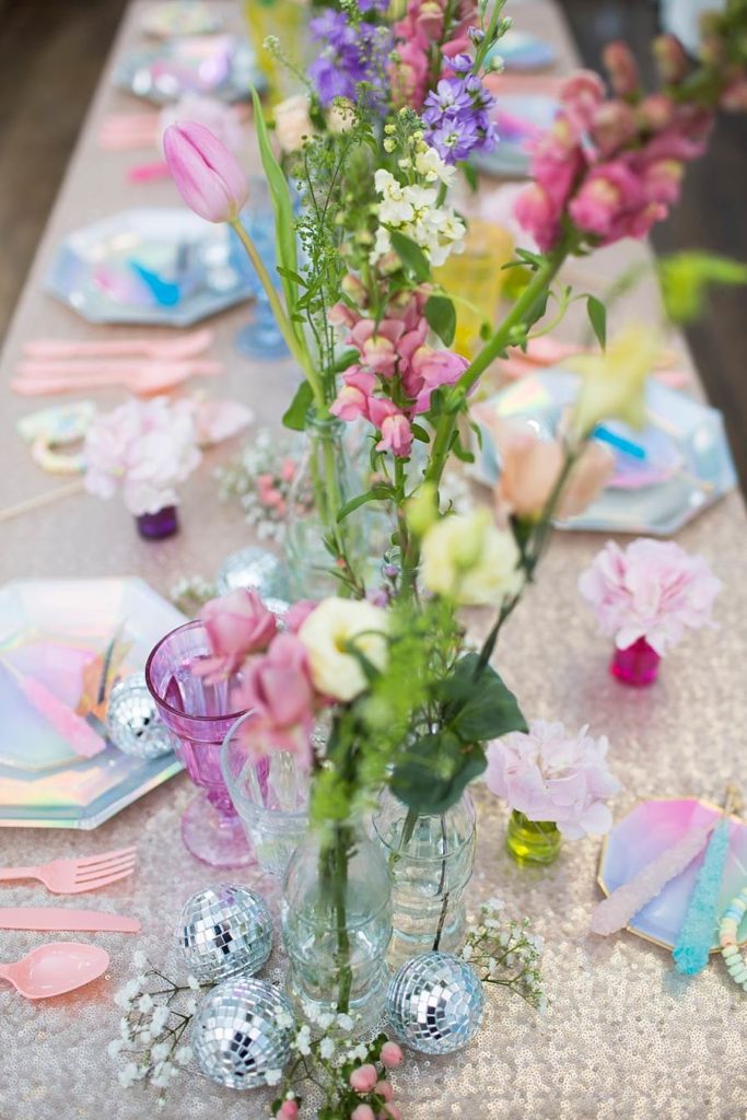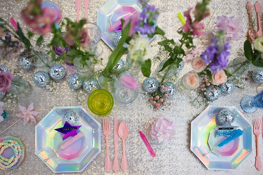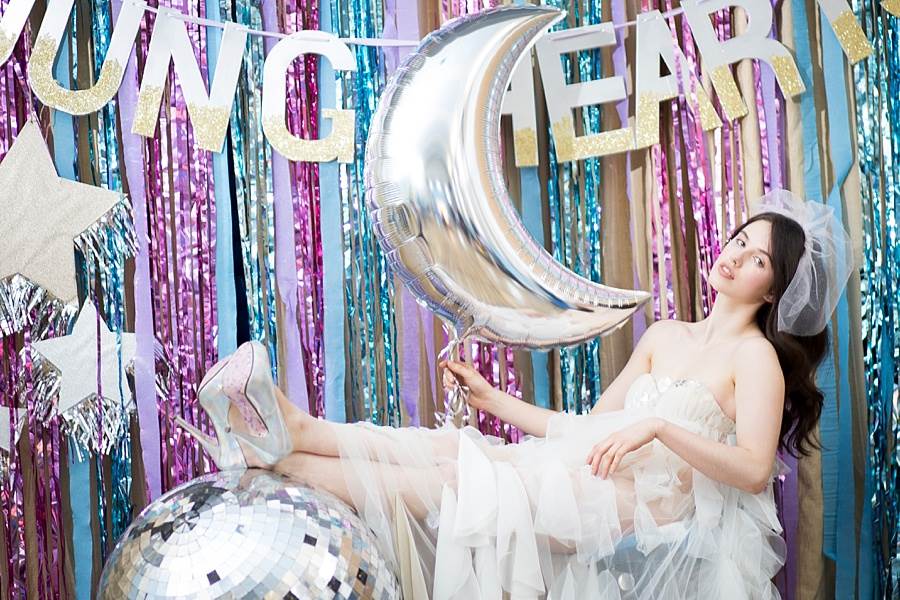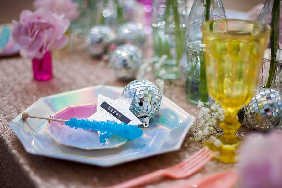 The key to recreating this prom wedding look is to embrace colour, namely pastels and candy shades – all sugary sweet and fun. And to mix up the styles – you don’t have to match anything at all. Disco balls, streamers, and sequins are your go-to prom props. Basically, have fun and don’t be afraid to dive headlong into 1970s-1980s American nostalgia!