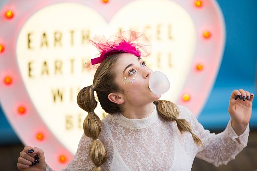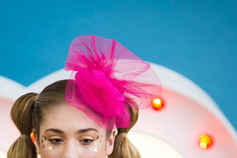 Erin describes the look, “It was based on the look and feel of the film of Stephen King’s Carrie, by Brian De Palma, along with influences from designers Meadham Kirchoff and Molly Goddard. It has its heart in 1970s–1980s Americana, with a bubblegum palette and a tongue-in-cheek, stylised tastelessness.