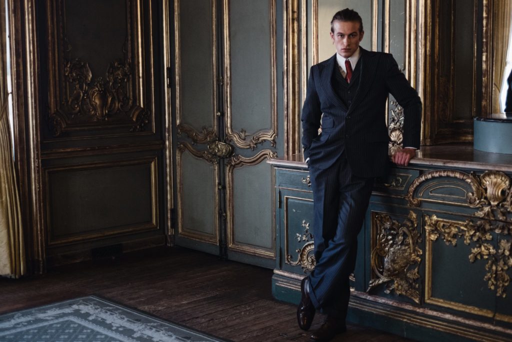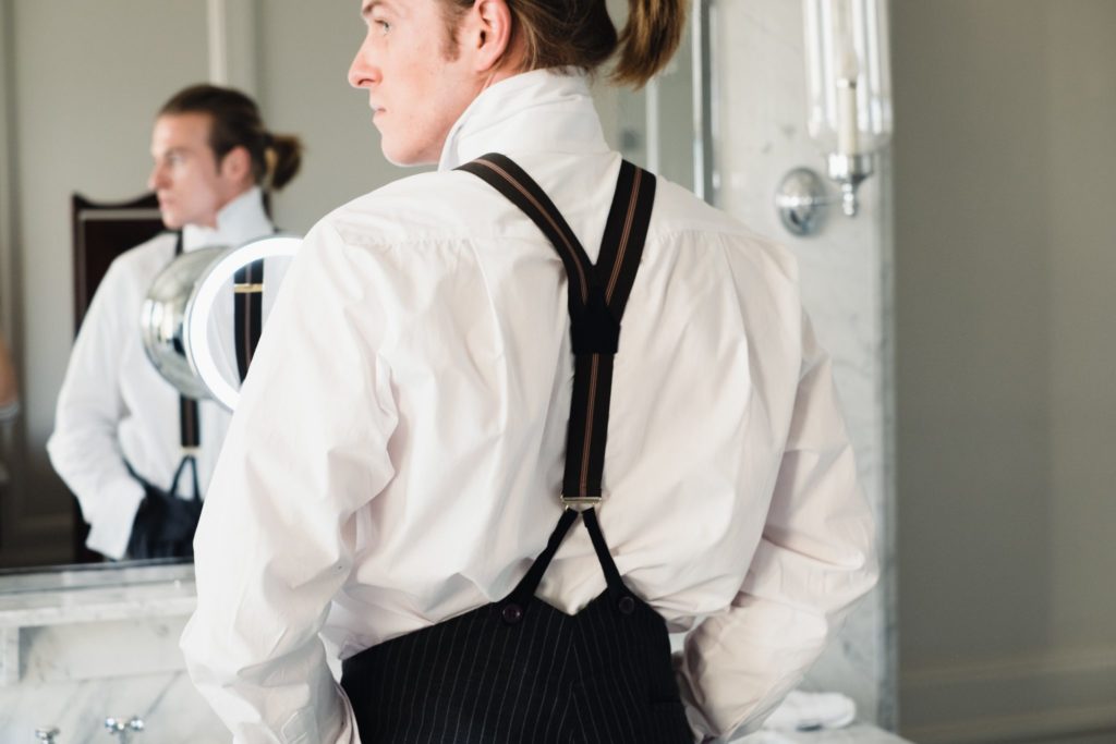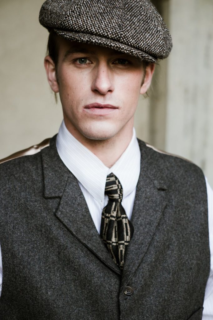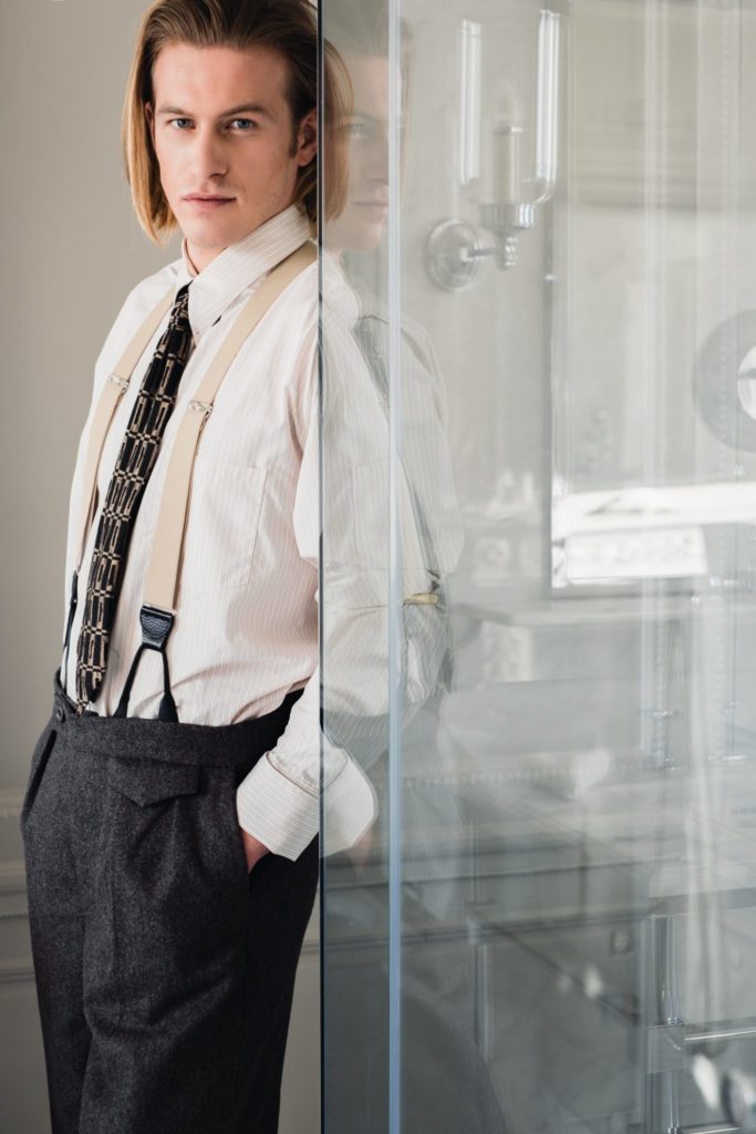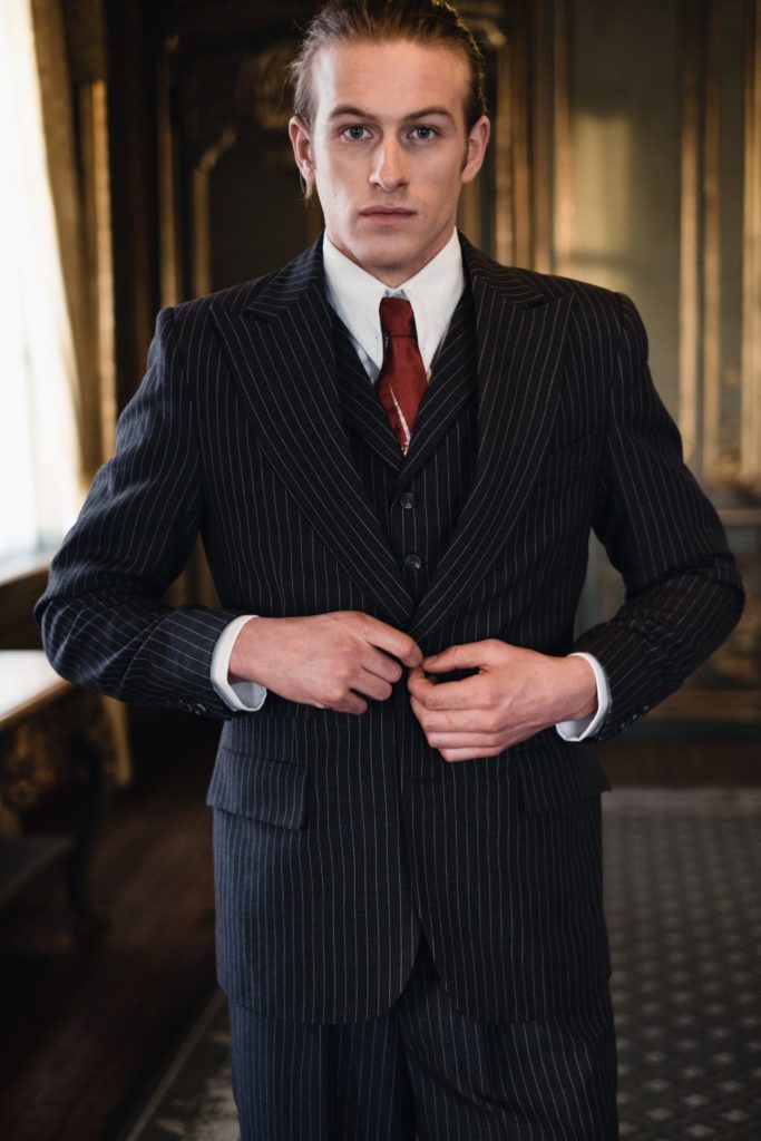 The details I particularly love are the high waisted trousers worn with button down braces which made the male model so tall. The waistcoats are based on a design from the late 1930s, with a revere collar and 6 buttons, always worn with the last button open – something that would have been done at the time.