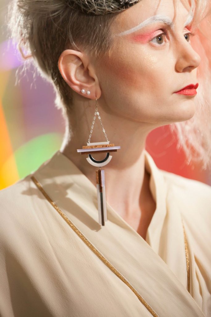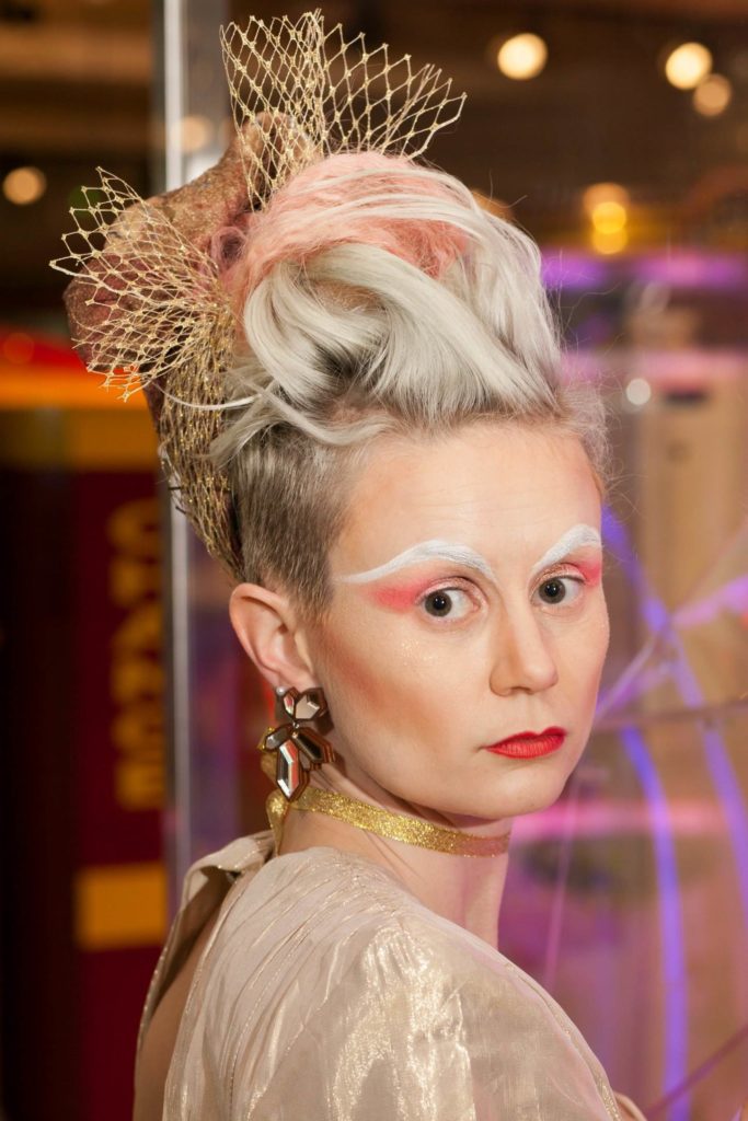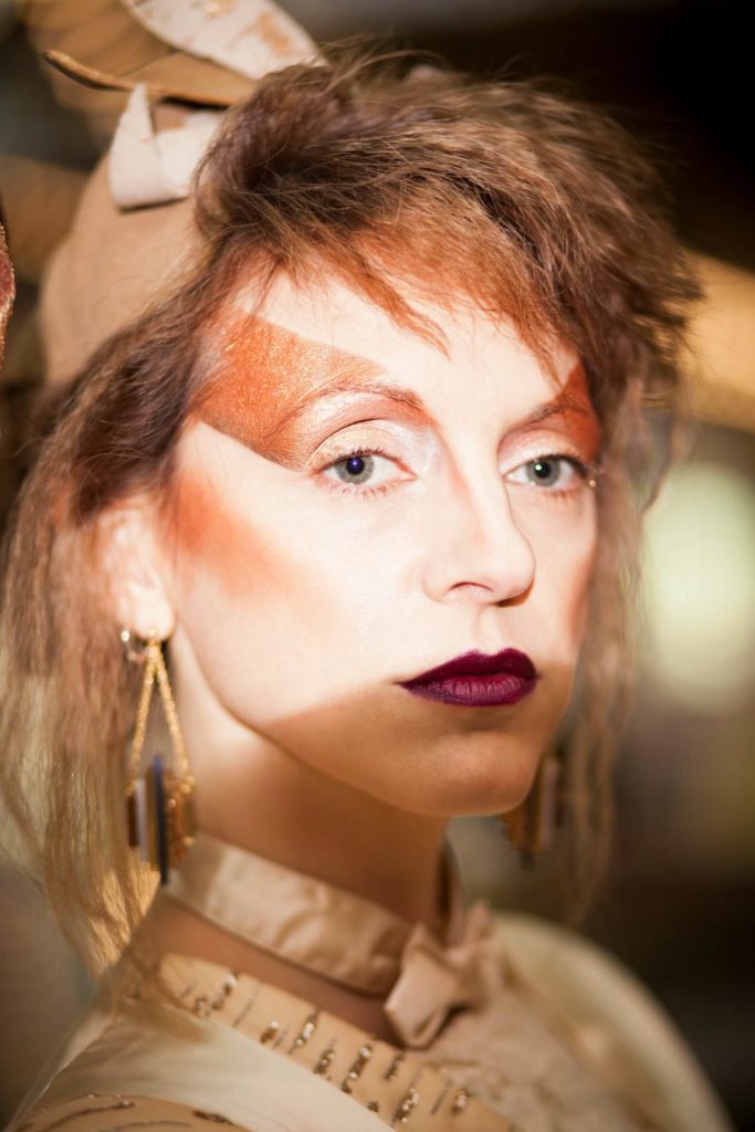 The stylist for the shoot, Myriam from La dame au beret continues, “The Blitz Kids were all about ‘the look’ – the clothes, the make-up, the hair, the attitude… and the music, obviously. Glamorous Punks, in a way. For the styling, I had in mind Visage’s Fade To Grey and David Bowie’s Ashes to Ashes videos (Bowie’s death was such a shock, less than a month after the shoot). I made a selection of late ‘70s-early ‘80s glittery clothing and accessories from Erin’s No Debutante preloved label, and chose some of my La dame au beret cocktail hats to perfect the models’ New Romantic looks. Headwear was one of the key accessories of the Blitz Kids, and milliner Stephen Jones started his career during that period.”