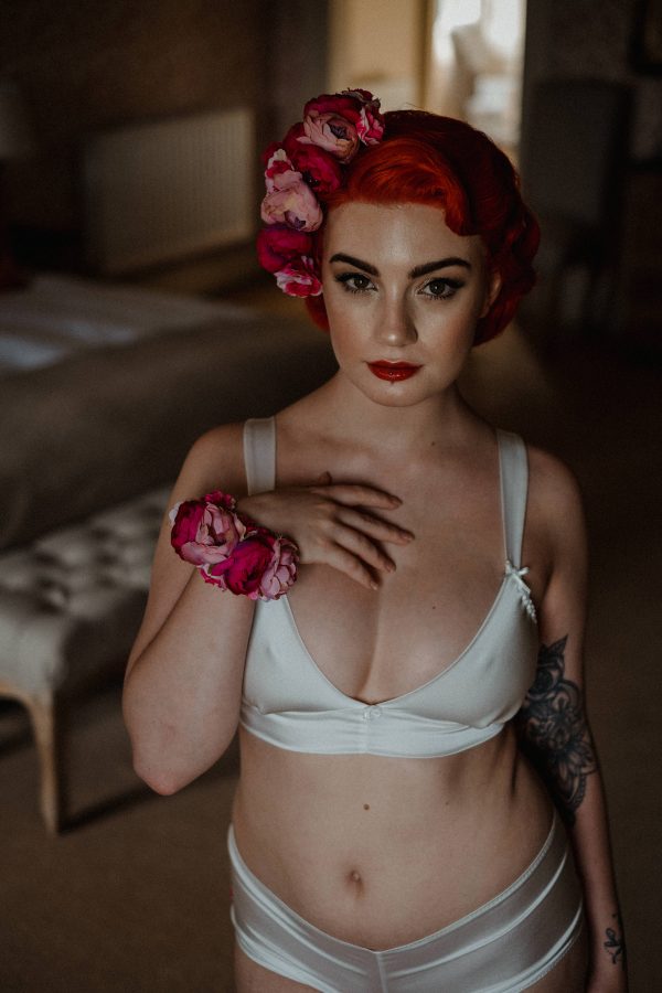 “The pin-up girls of the early 1900s are a true testament to how owning what you’ve got and being yourself is what really counts when it comes to a boudoir shoot. So who else better to help our models get into the vibe of the shoot than Sarah from Pin Up Curl who just oozes style and glamour, and transposes this onto anyone whose hair touches her fingers. Amy George worked her signature magic on our lovely models, Gemma and Tiffany, creating the most stunning wedding day looks and showcasing their natural beauty.”