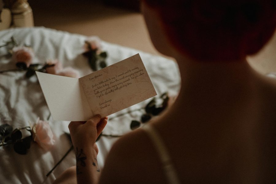 As part of this shoot, we also wanted to highlight more than just the boudoir element by shining a spotlight on what a special time getting ready on the morning of your wedding can be. Laying out your signature wedding scent, lighting some candles, and reading a letter specially prepared by your loved one on your wedding day is a lovely way to take some time to appreciate what the day ahead really means to you.”