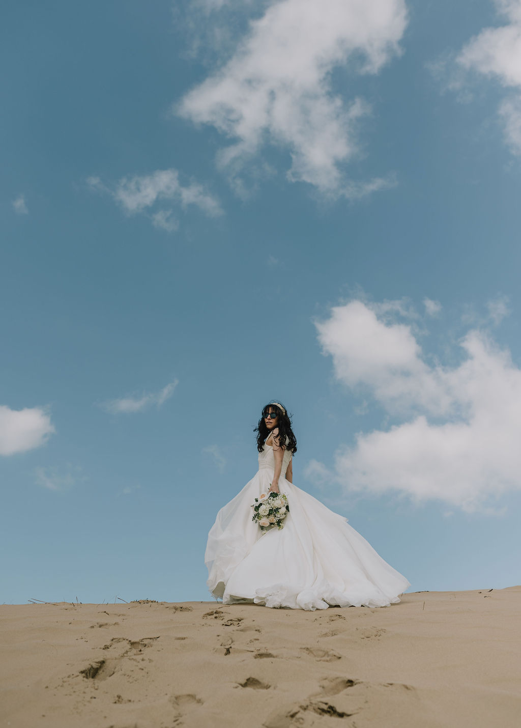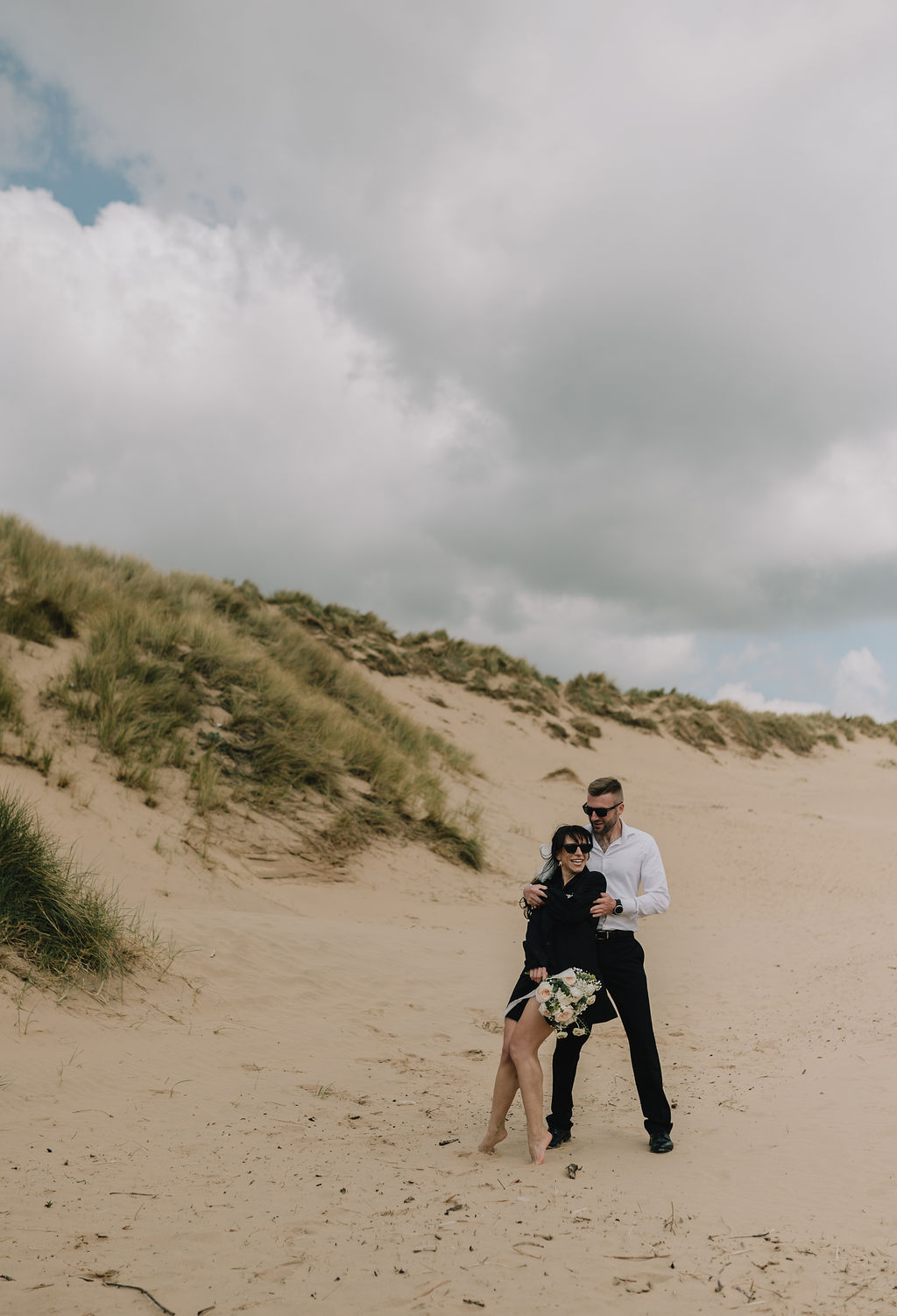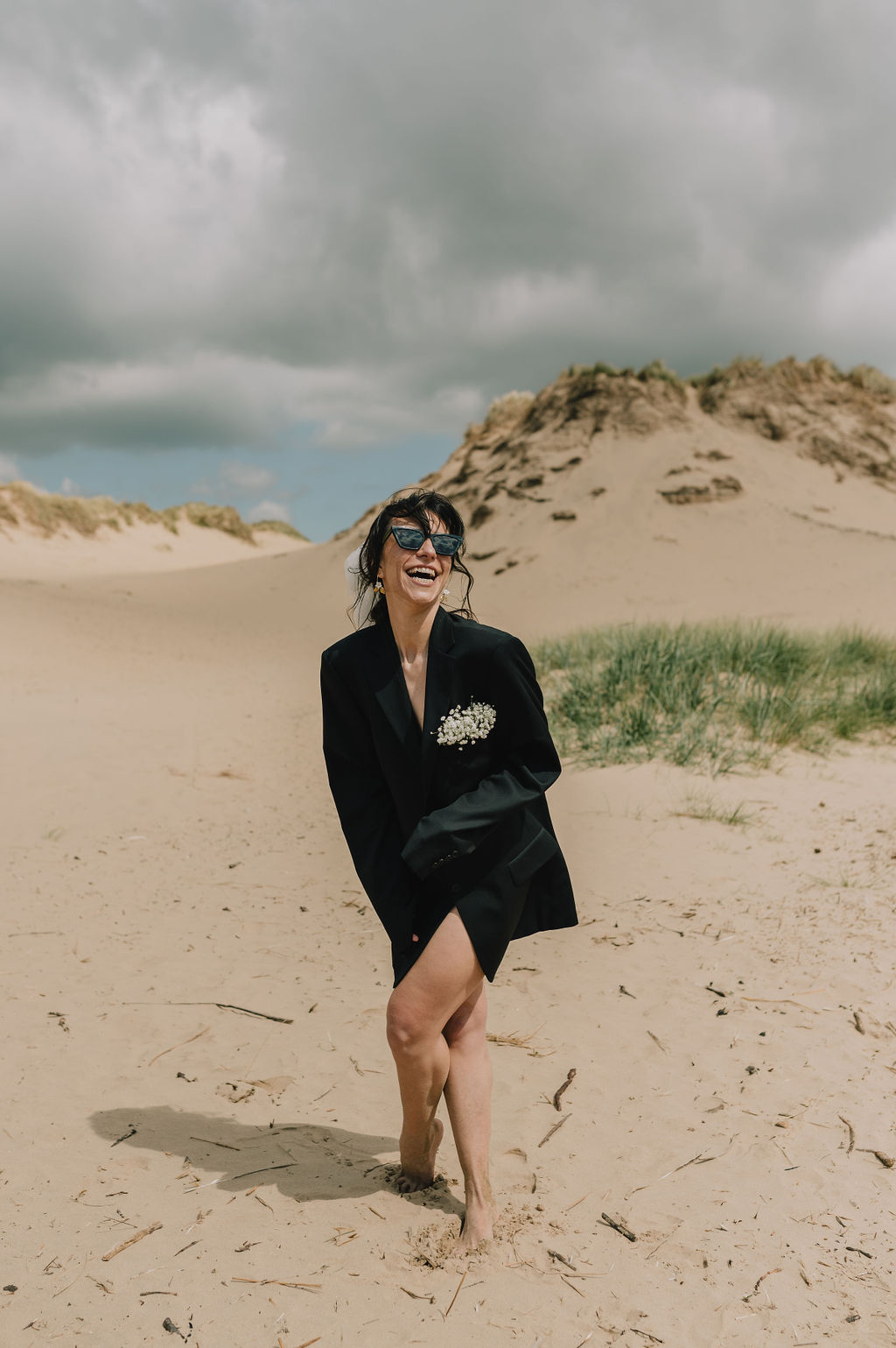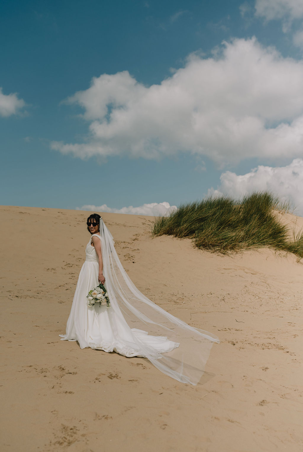 Paulina says: “I really wanted to show two free spirits coming together to elope. With a relaxed and unmanufactured feel, presenting an emotion of wild and free, as seen by the setting. I wanted a laid-back with an edge of sophistication. Using the usual wedding attire but in a way that created a sense of elopement, almost reckless in love. My advice on turning a beach elopement into reality for your wedding day is to be brave, being you is your first priority. We chose this beach in particular due to the untamed and unpolished serenity of sand dunes, they provided a sense of beauty and power, a landscape ever-changing but full of power, like a good marriage.”