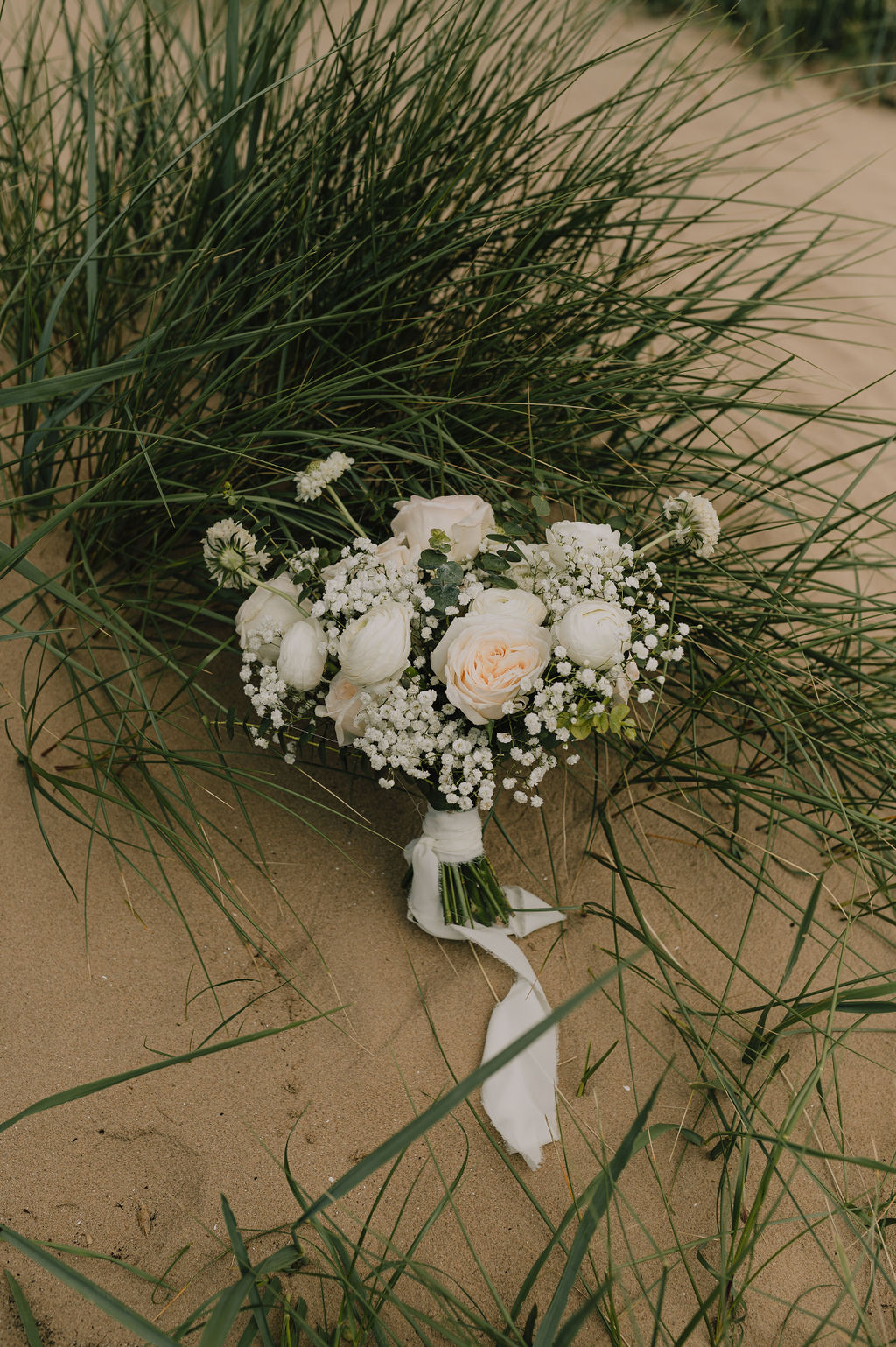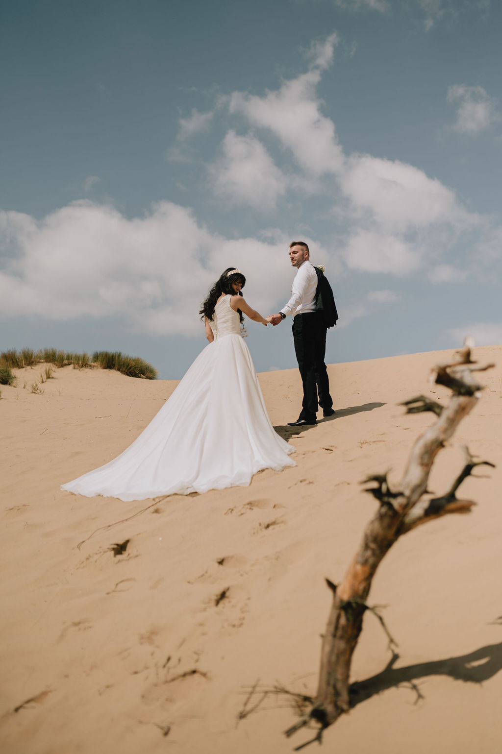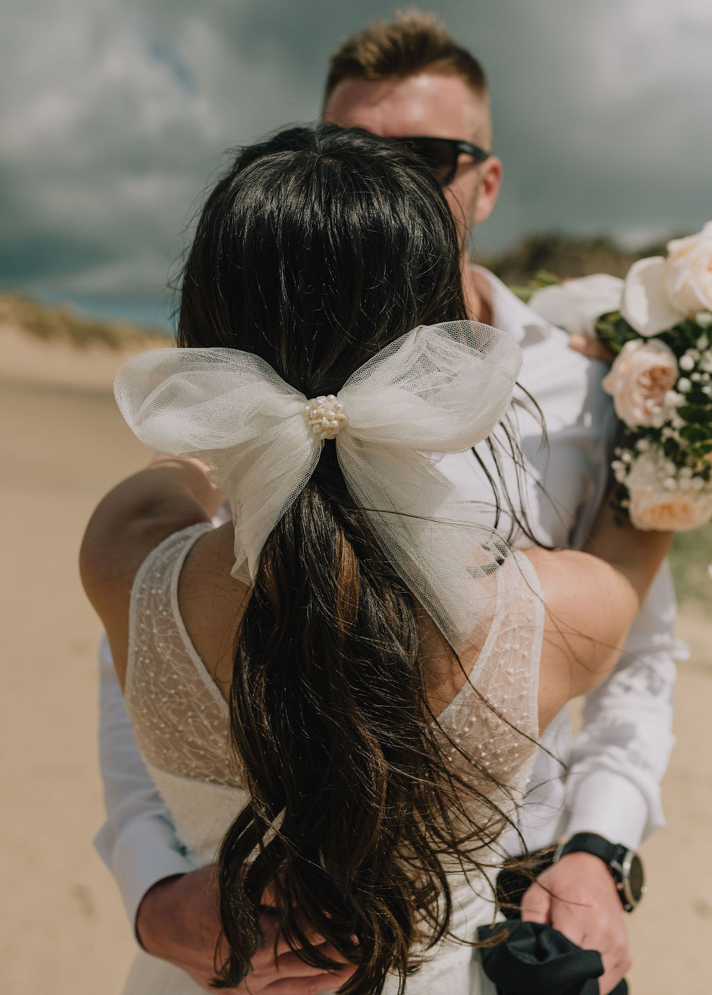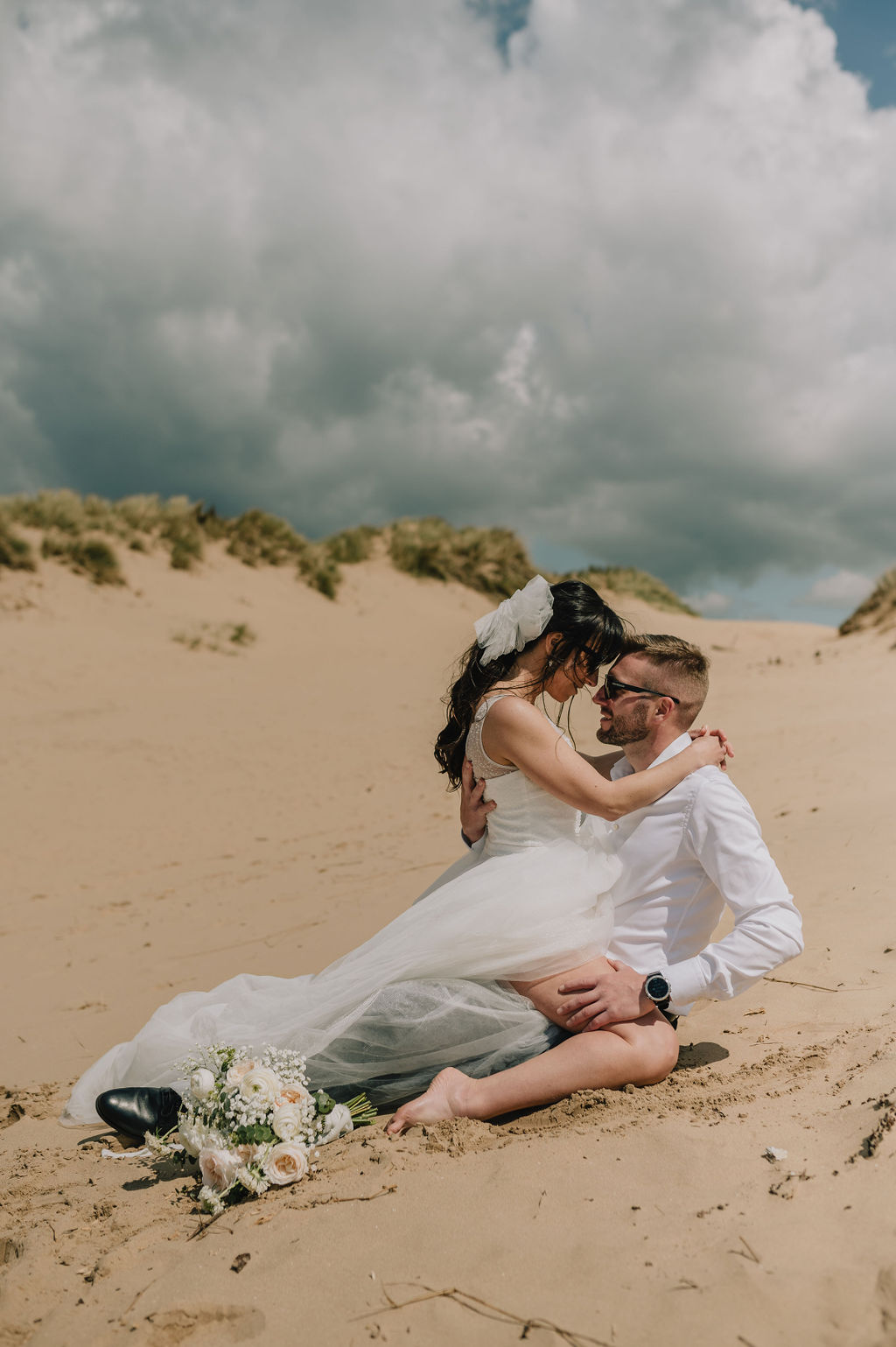 Paulina says: “I really wanted to show two free spirits coming together to elope. With a relaxed and unmanufactured feel, presenting an emotion of wild and free, as seen by the setting. I wanted a laid-back with an edge of sophistication. Using the usual wedding attire but in a way that created a sense of elopement, almost reckless in love. My advice on turning a beach elopement into reality for your wedding day is to be brave, being you is your first priority. We chose this beach in particular due to the untamed and unpolished serenity of sand dunes, they provided a sense of beauty and power, a landscape ever-changing but full of power, like a good marriage.”